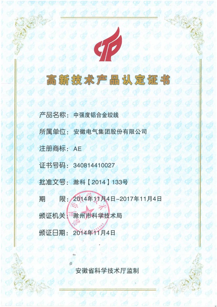 2014年11月4日,安徽電氣集團自主研發(fā)的中強度鋁合金絞線,被安徽省滁州市科學技術局認定為高新技術產品,榮獲《高新技術產品認定證書》。